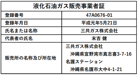 | 免許資格等 | 液化石油ガス販売事業47A0676-01 認定保安機関第47A0106RA号 特定液化石油ガス設備工事第561120号 |